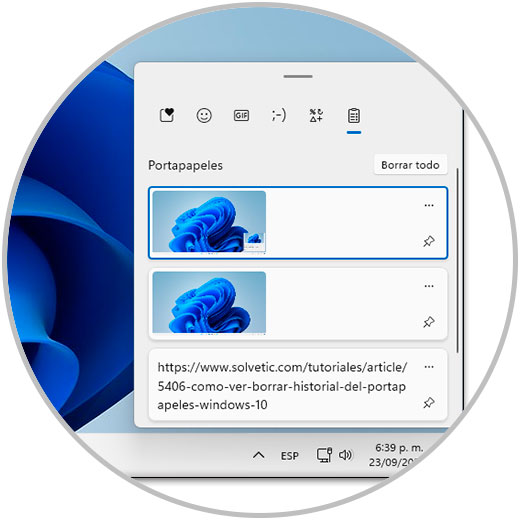 Para ver el contenido del portapapeles en Windows 11, usaremos las teclas siguientes, en la esquina inferior derecha del escritorio veremos el contenido de este: