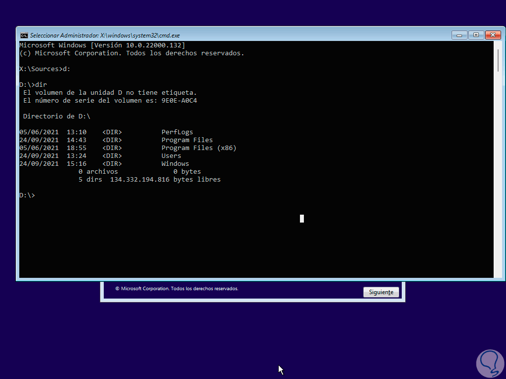 Ejecuta “d:” para acceder a la unidad del sistema, luego lista el directorio con el comando "dir":