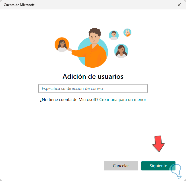 Será desplegada la siguiente ventana. Ingresamos la dirección de correo a vincular, damos clic en Siguiente