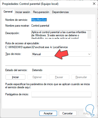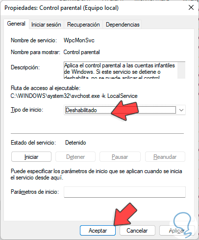Veremos lo siguiente. En el campo "Tipo de inicio" seleccionamos "Deshabilitado":