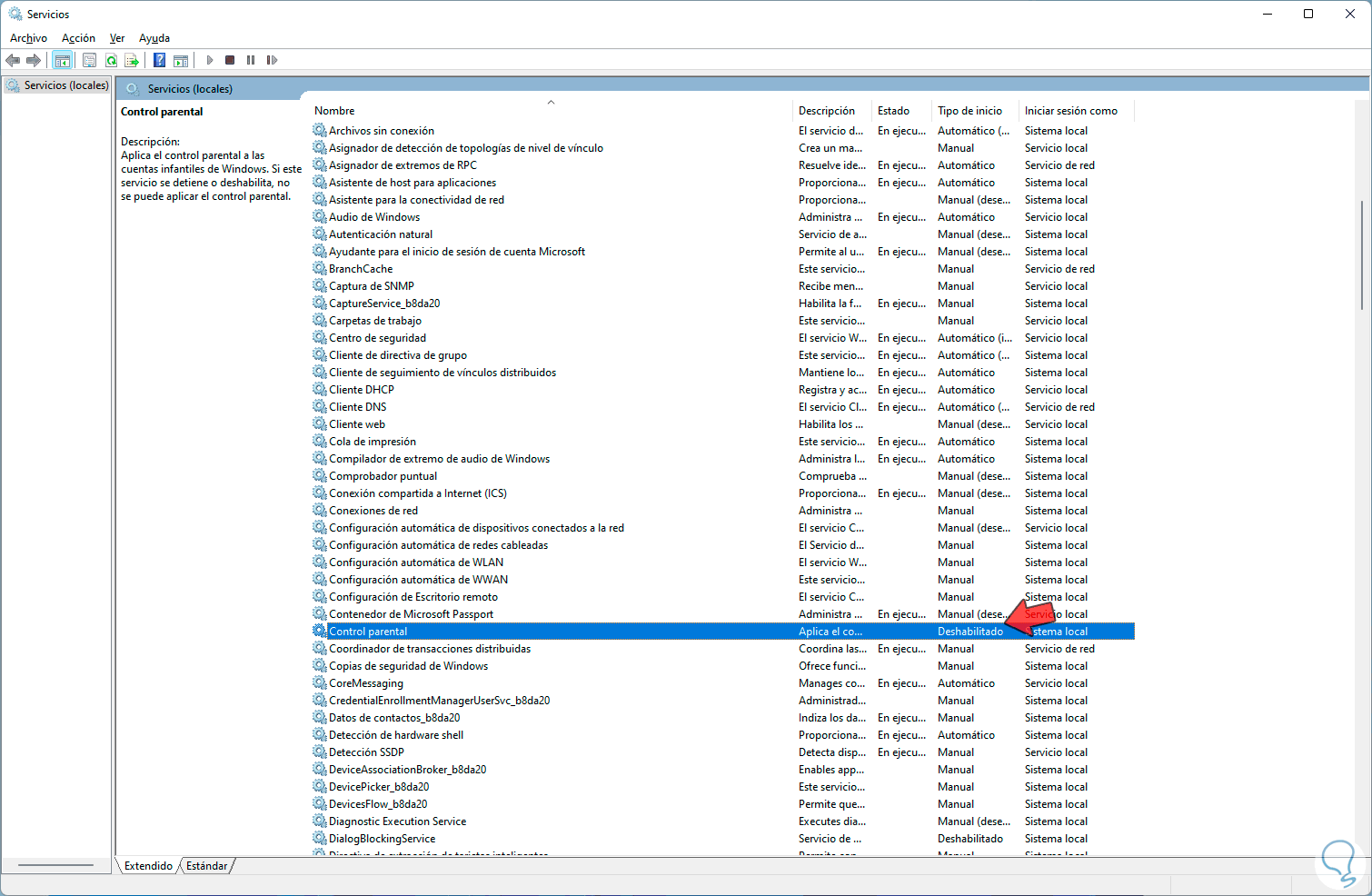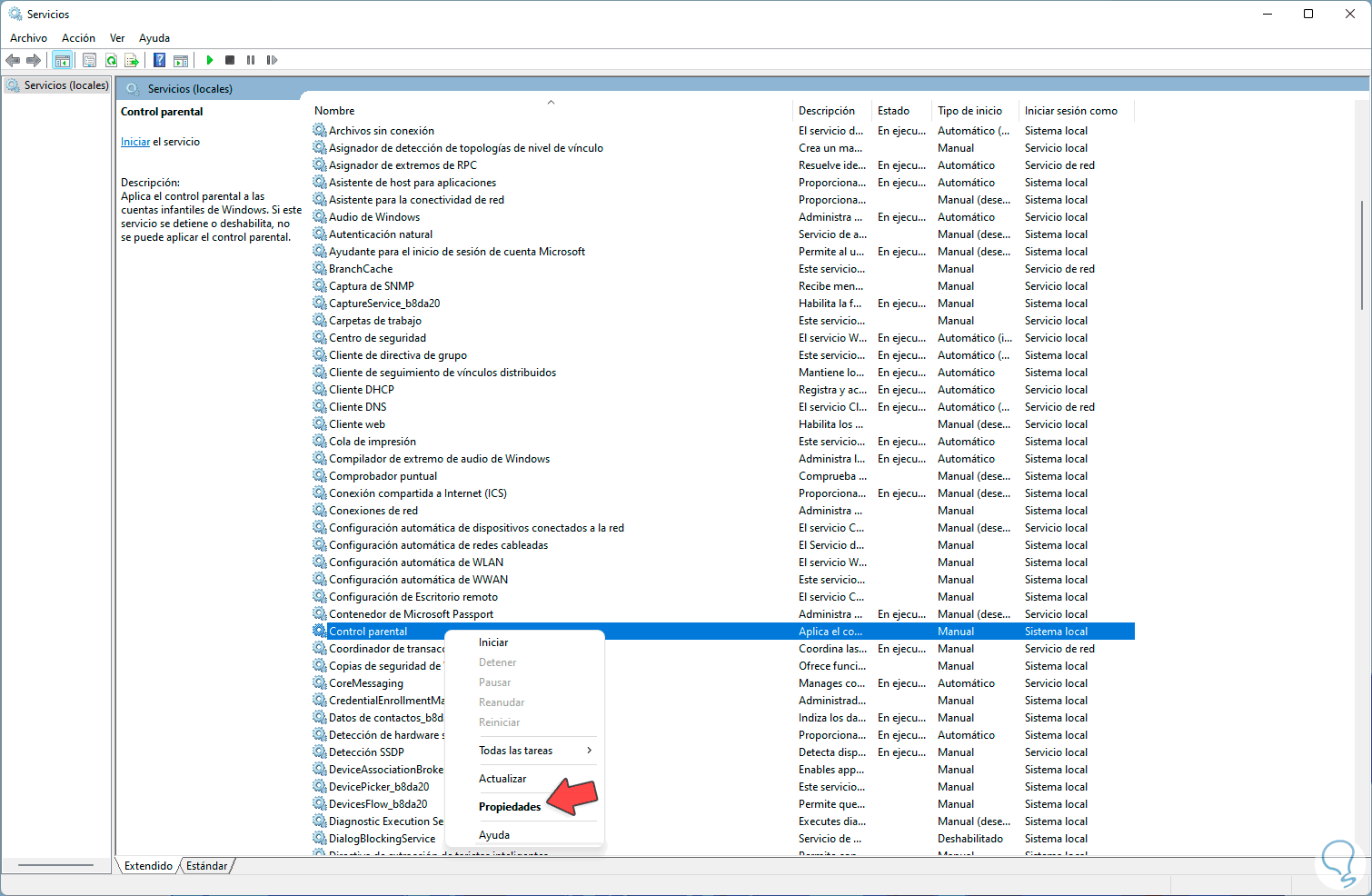 Una vez detenido el servicio damos clic en "Abrir servicios" en la parte inferior del Administrador de tareas, en la ventana de los servicios locales damos clic derecho sobre el servicio "Control Parental" y