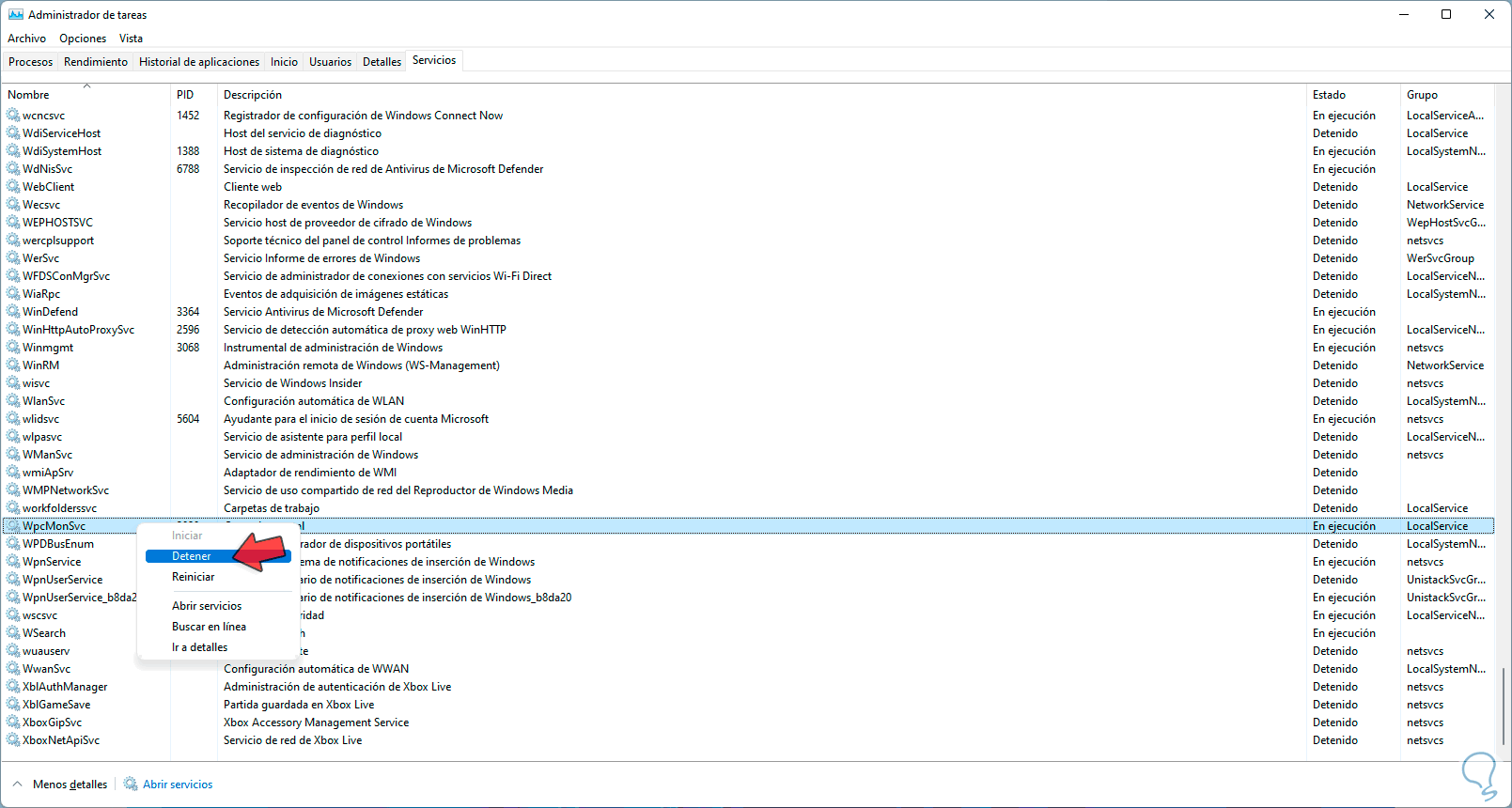 Damos clic derecho sobre WpcMonSvc y seleccionamos la opción "Detener". Este es el servicio que se encarga de activar y que este en uso el control parental.
