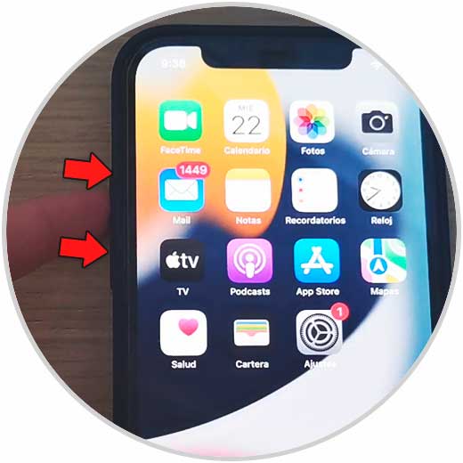 Ahora mantén pulsados a la vez los botones de "Bajar volumen" y "botón de apagado". Mantenlo, aunque salga el logo de Apple