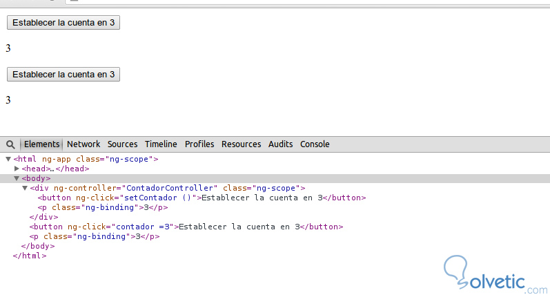 En el ejemplo vemos que en nuestro contenido de controlador estamos estableciendo el valor de una propiedad de forma explícita, con ello podemos pasar el valor del objeto $scope a la vista; en la siguiente sección hemos creado un botón que invoca el método del controlador. Finalmente hacemos un nuevo botón que hace la asignación de forma explícita y tenemos un código que es equivalente.