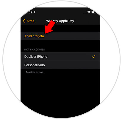 Lo siguiente que debes hacer es“Añadir tarjeta” para añadir una tarjeta en Apple Pay o utilizar una en el caso de que ya tengas configuradas.