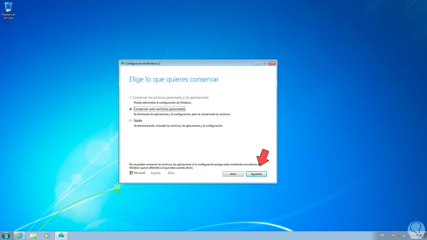 Activamos la casilla "Conservar solo archivos personales", damos clic en Siguiente