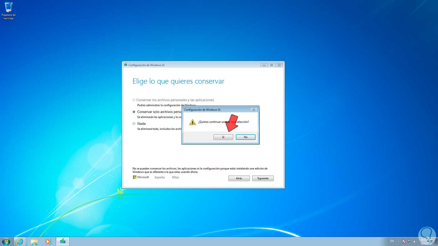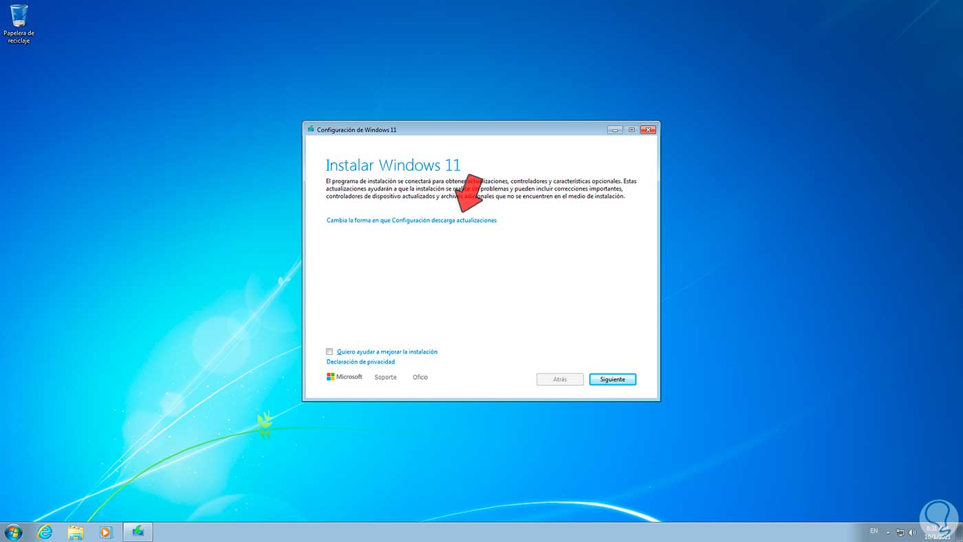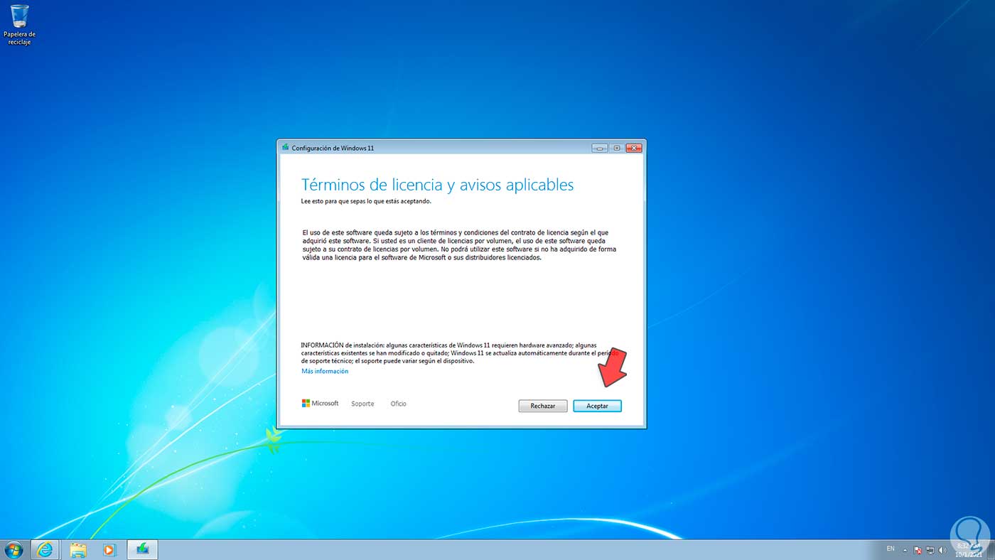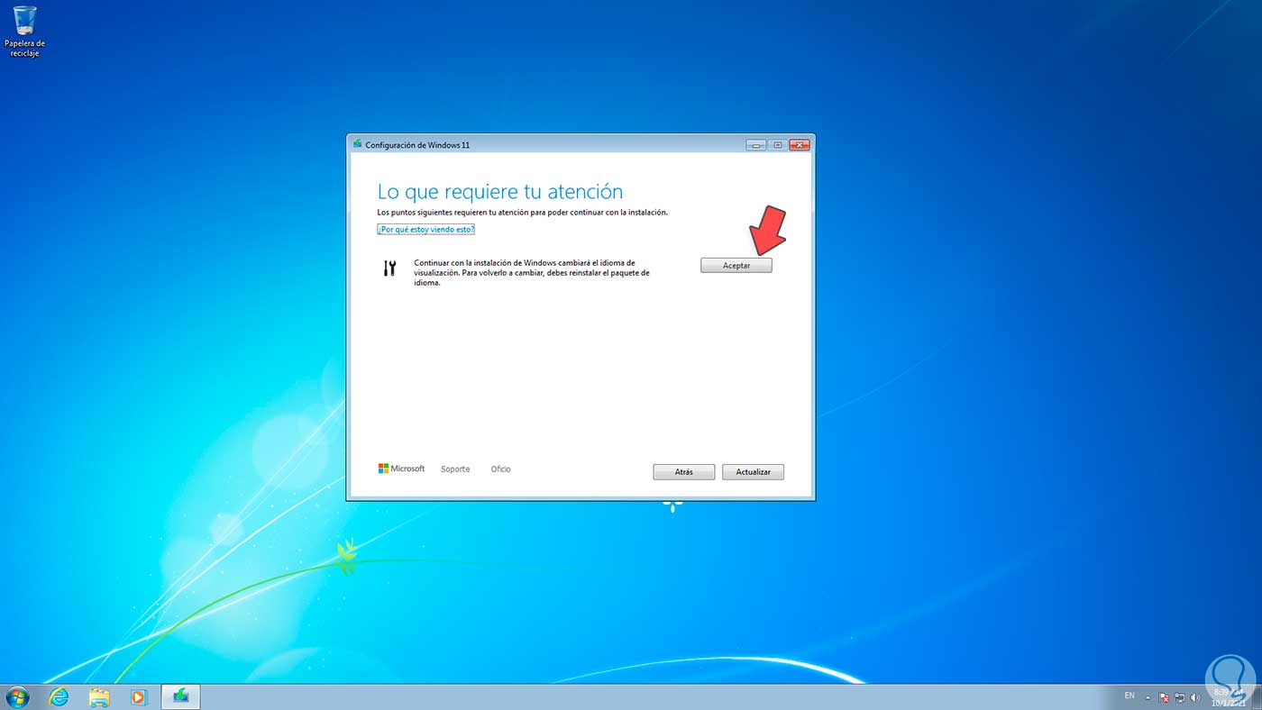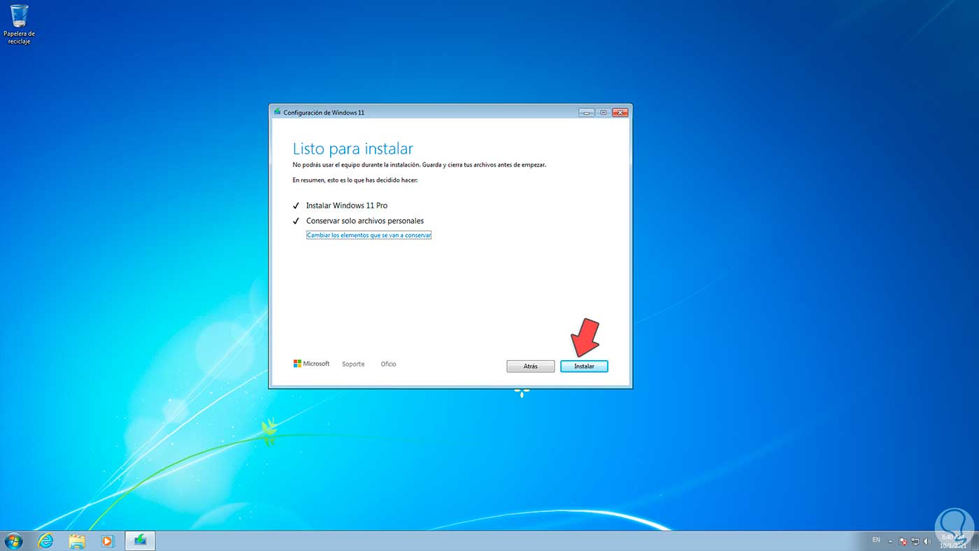 Damos clic en Aceptar para continuar, veremos el resumen de la actualización d Windows 7 a Windows 11. Damos clic en "Instalar" para iniciar la actualización de Windows 7 a Windows 11 de forma correcta conservando los archivos personales