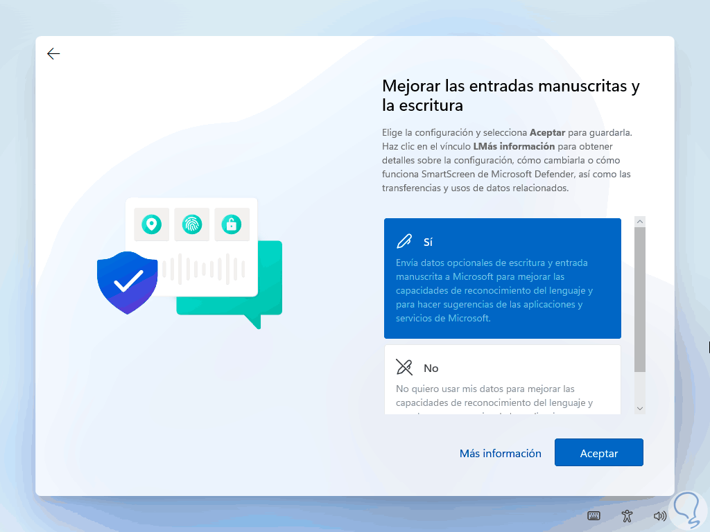 Damos clic en Siguiente para aceptar los términos de licencia. Damos clic en Aceptar para definir de qué forma se actualizará el sistema: