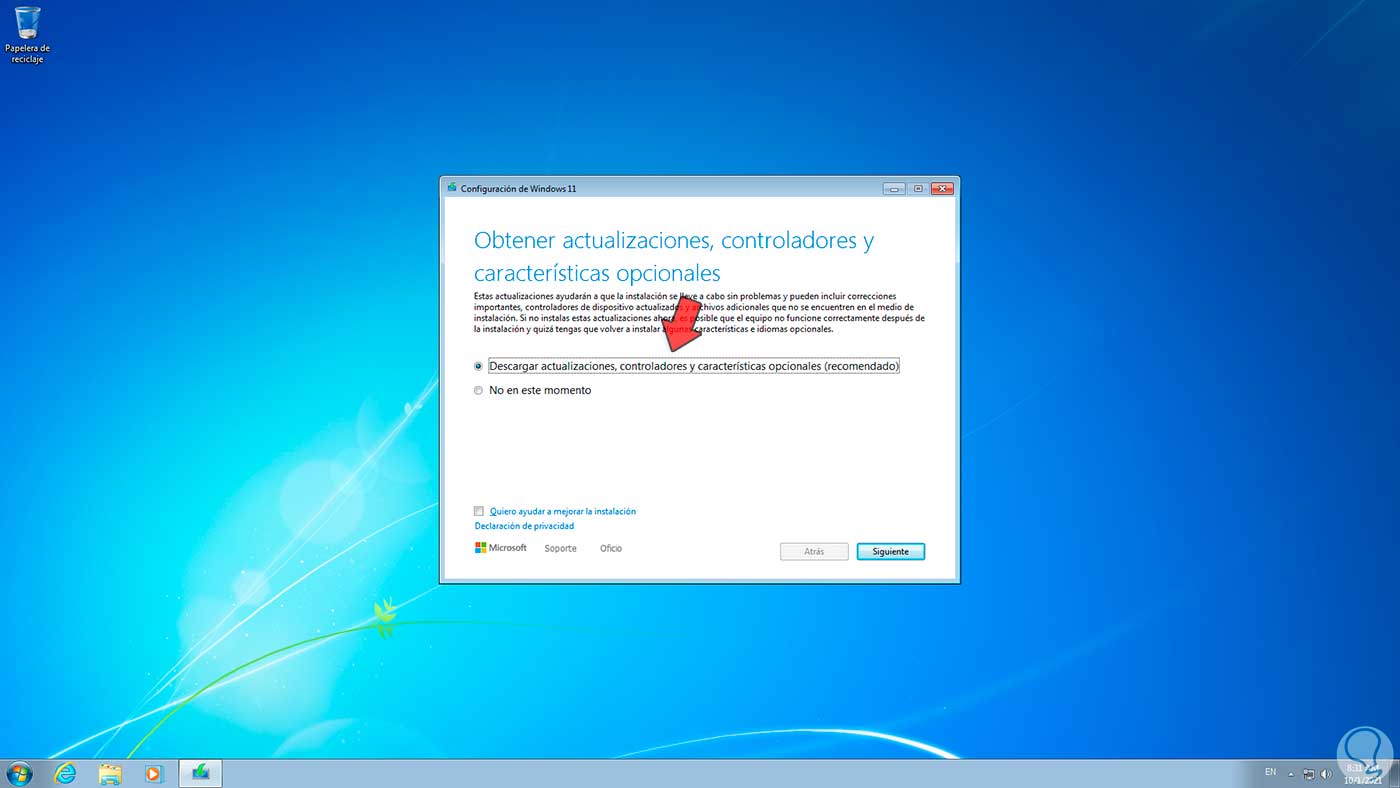 Veremos las siguientes opciones. En este caso dejamos activa la casilla "Descargar actualizaciones, controladores y características opcionales (recomendado)" y damos clic en "Siguiente",