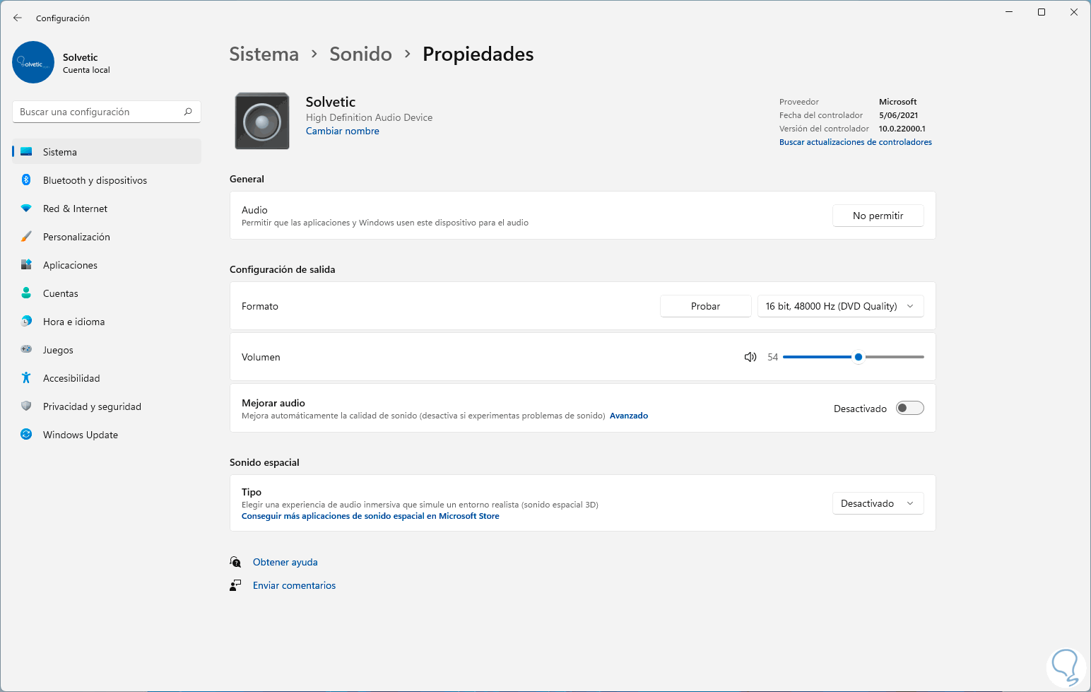 En la sección Sonido podemos visualizar el cambio de los nombres de los dispositivos de audio: