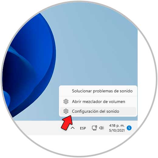 El otro método a usar es directamente desde Configuración, para ello pulsamos sobre el icono de sonido en la barra de tareas y seleccionamos la opción "Configuración del sonido":