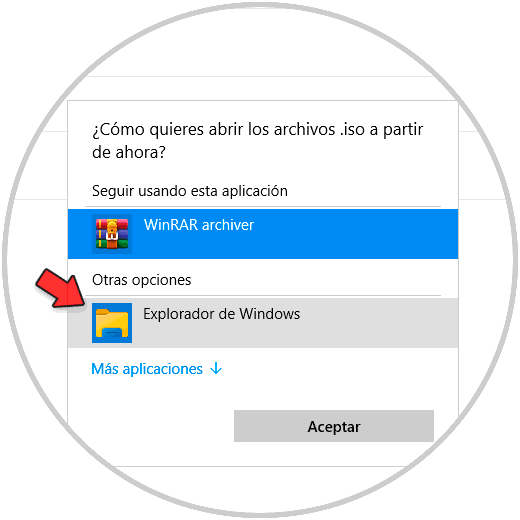 En la sección .iso damos clic y en la ventana emergente seleccionamos "Explorador de Windows":