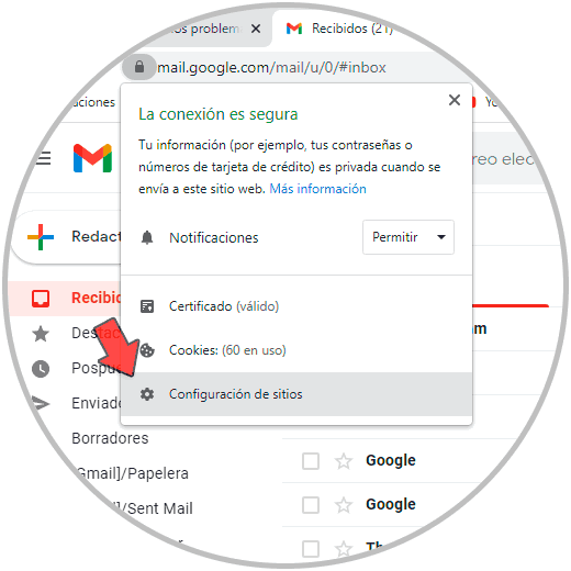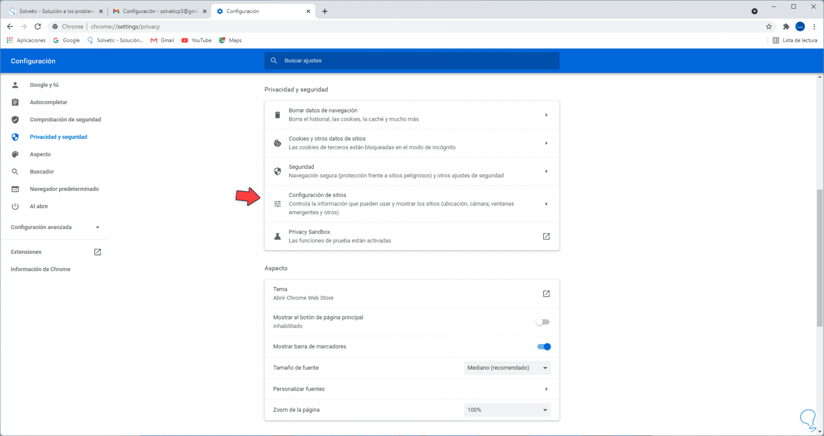 En la sección "Privacidad y seguridad" damos clic en "Configuración de sitios":