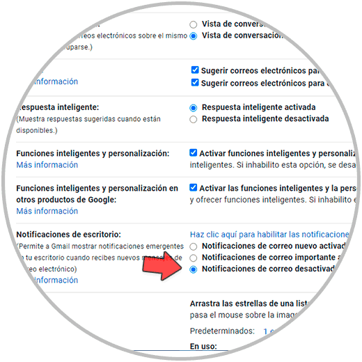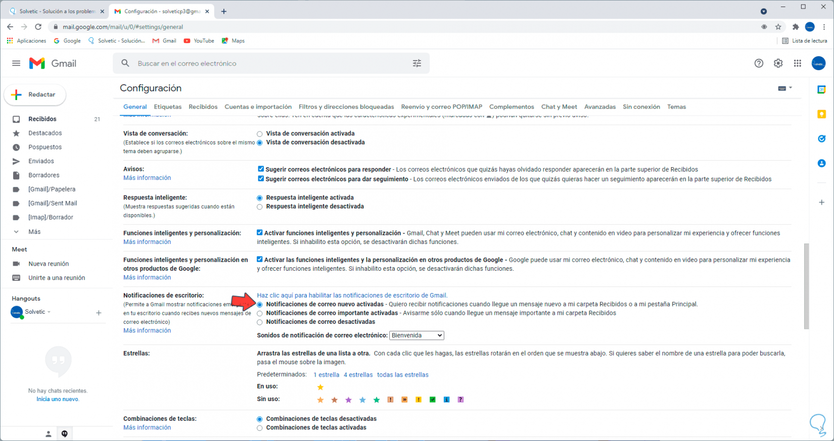 Esto con el fin de que recibamos las notificaciones, ahora en Gmail activamos la casilla "Notificaciones de correo nuevo activadas":