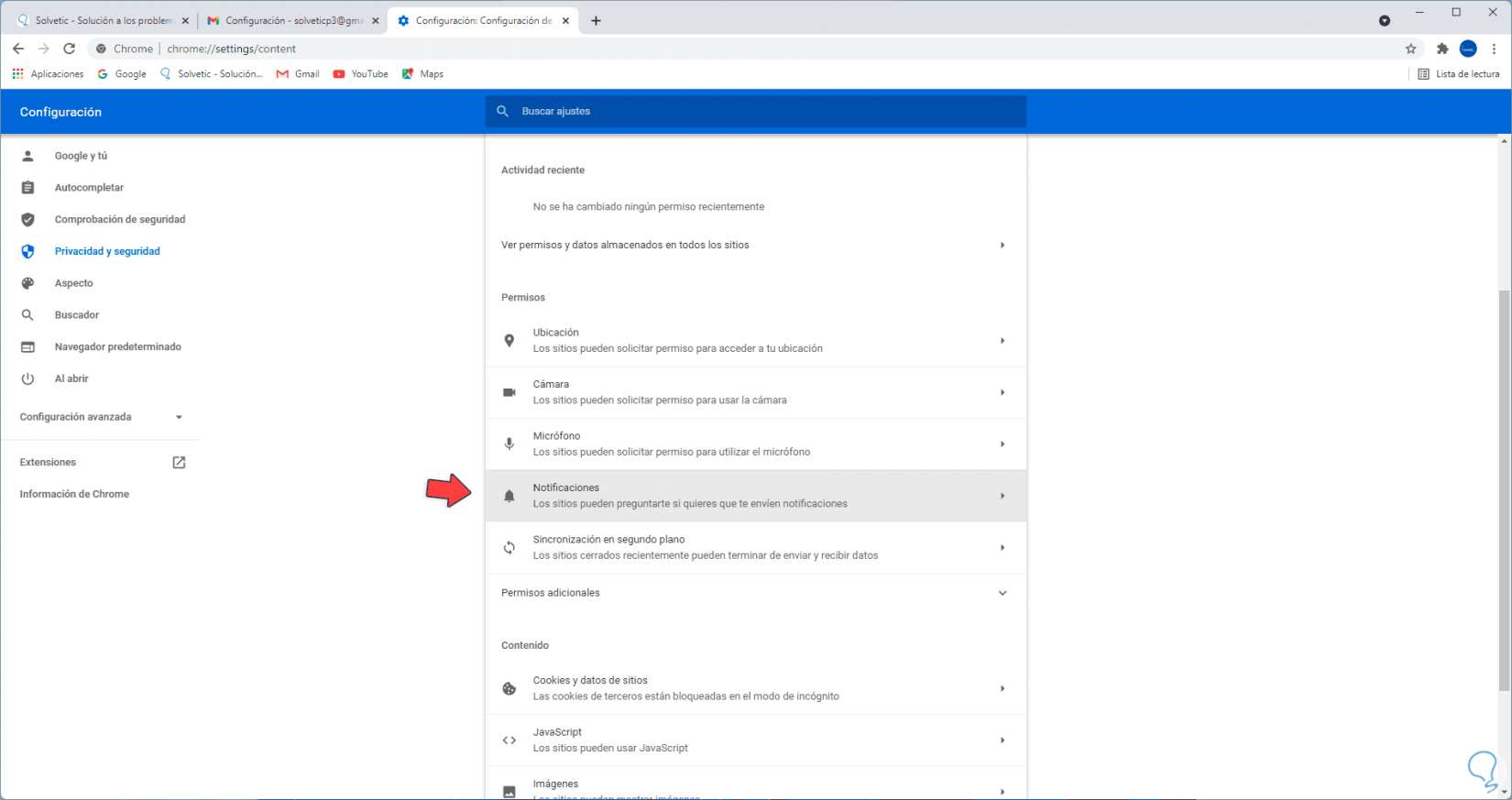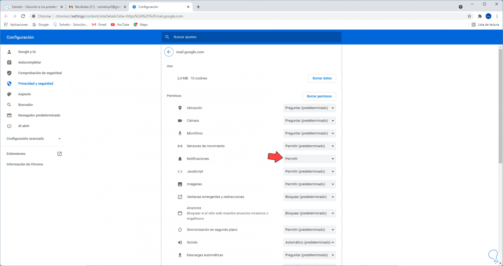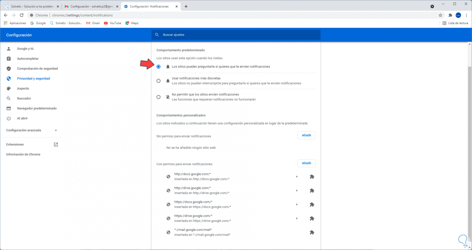 En Notificaciones, validamos que el interruptor "Los sitios pueden preguntarte si quieres que te envíen notificaciones" esté activo:
