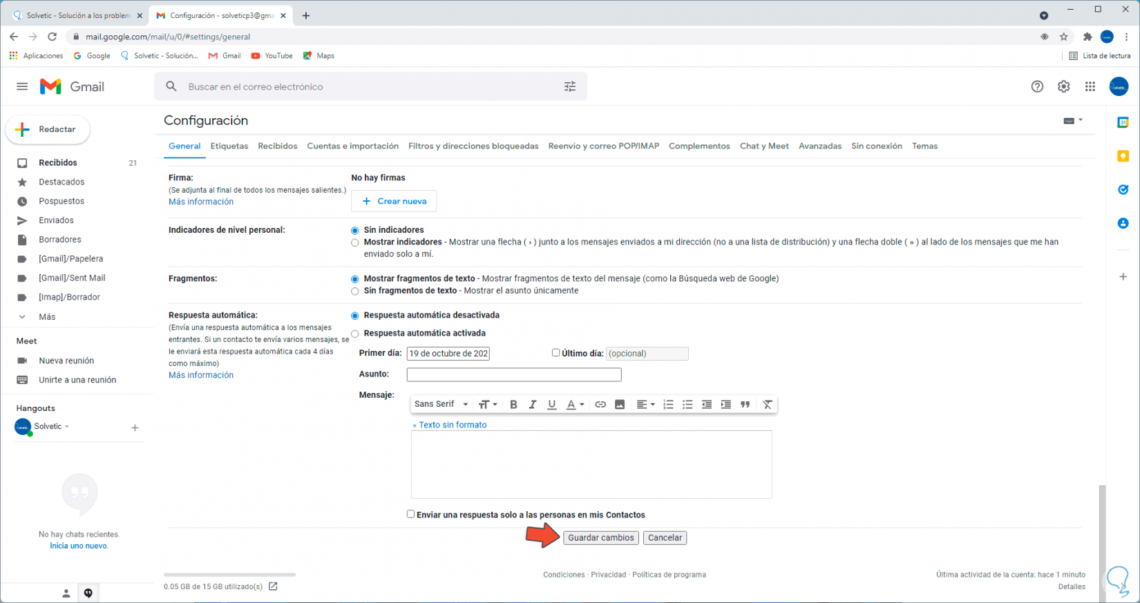 Damos clic en "Guardar cambios" en la parte inferior de configuración de Gmail: