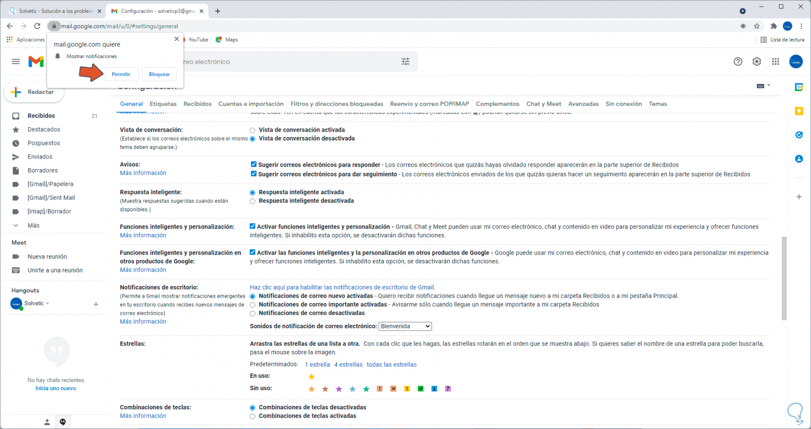 Después, damos clic en "Haz clic aquí para habilitar las notificaciones de escritorio de Gmail" y en la parte superior en la ventana emergente damos clic en “Permitir":