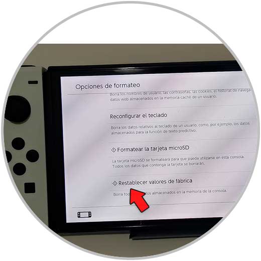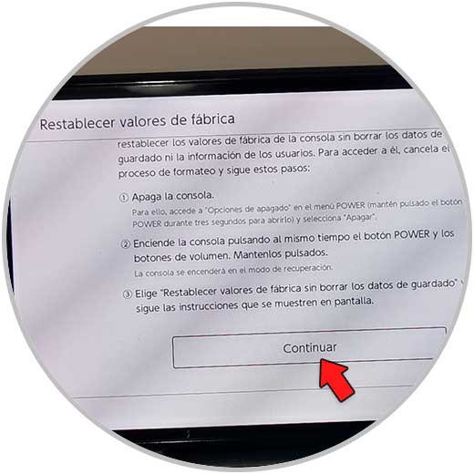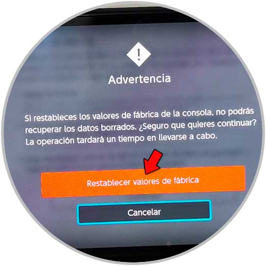 Veremos otro mensaje de advertencia. Pulsa en "Restablecer valores de fábrica" y comenzará el reseteo de la Switch
