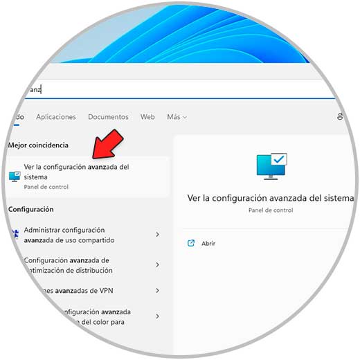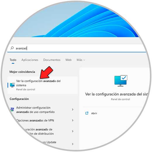 Para hacer uso de esta función, en el buscador ingresamos “avanzada” y seleccionamos "Ver la configuración avanzada del sistema":