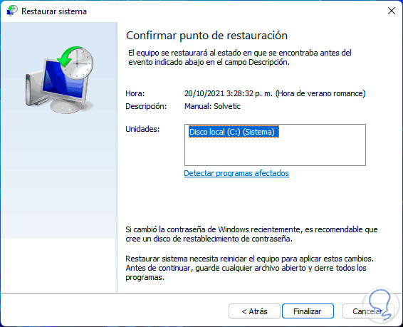Con esto el punto de restauración estará listo para ser usado cuando el sistema falle por alguna causa.