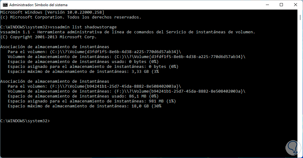 - <Volumen2>: indica la letra de la unidad donde se alojará el almacenamiento de instantáneas