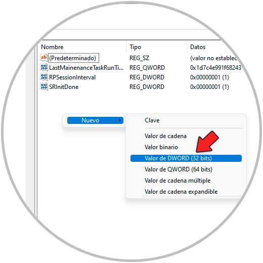 HKEY_LOCAL_MACHINE\SOFTWARE\Microsoft\Windows NT\CurrentVersion\SystemRestoreAllí damos clic derecho en algún lugar libre y seleccionamos “Nuevo -Valor de DWORD 832 bits)”: