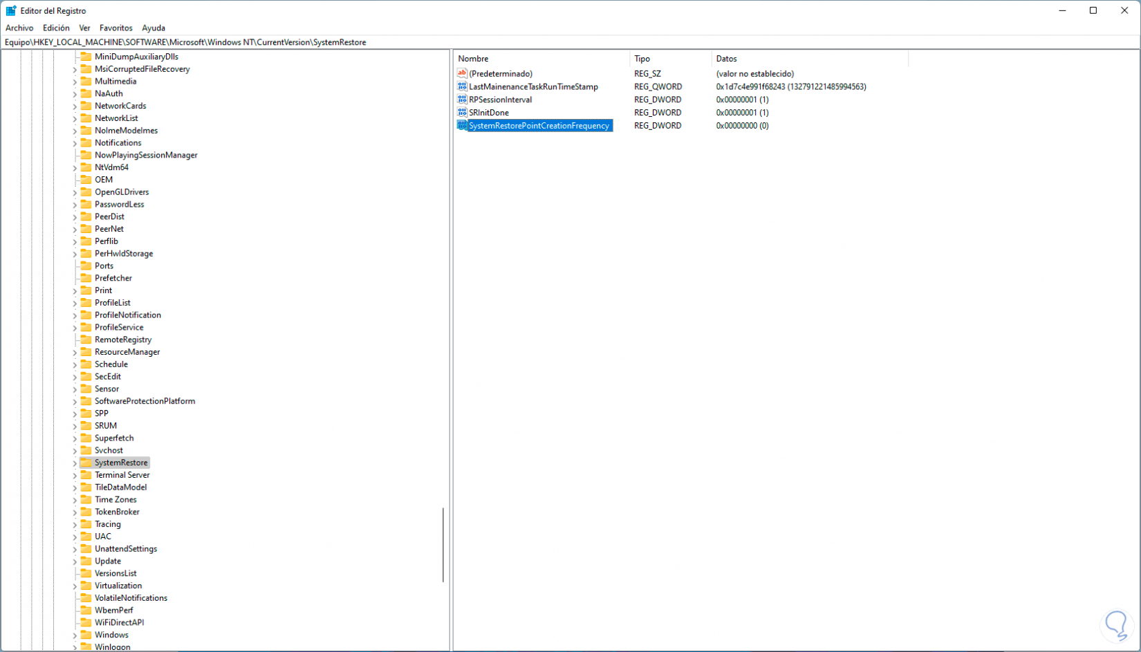 Una de ellas es cambiar la frecuencia de ejecución de Restaurar sistema según sea necesario, para ello abrimos el Editor de registros desde Inicio con regedit: