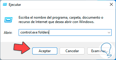 En la ventana del comando ingresamos "control.exe folders": Pulsamos en Aceptar para abrir las propiedades.