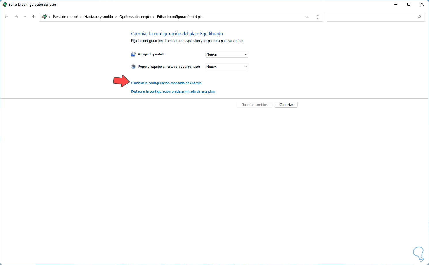 Seleccionamos la opción "Editar plan de energía", luego veremos lo siguiente. Damos clic en "Cambiar la configuración avanzada de energía"