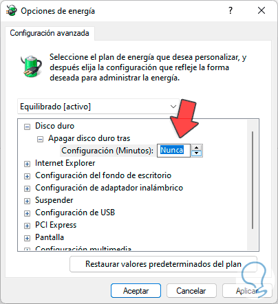 Con esto evitaremos que el disco duro se apague en Windows 11 y aunque no estemos usándolo, Windows 11 no apagará nuestro disco y después lo encenderá cuando volvamos a usarlo.