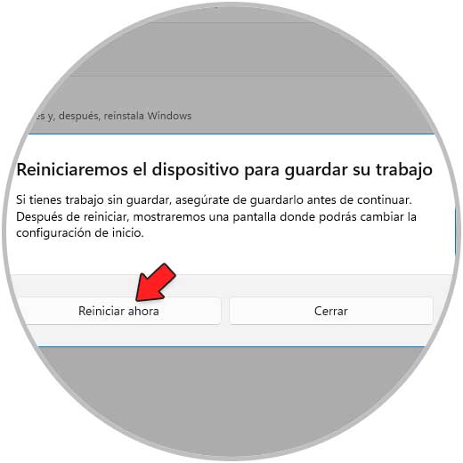Allí damos clic en "Reiniciar ahora" en la sección Inicio avanzado: