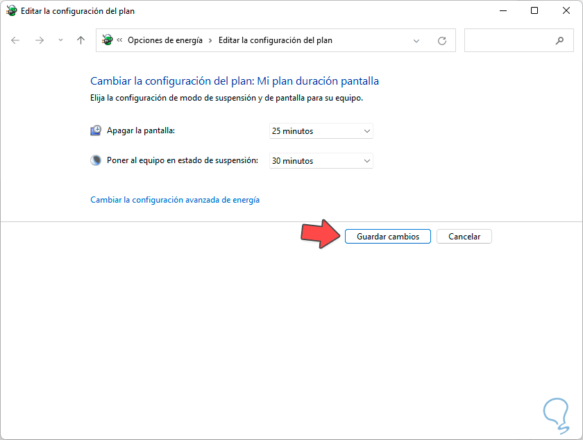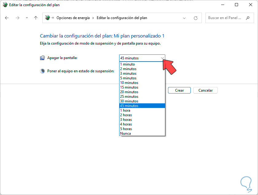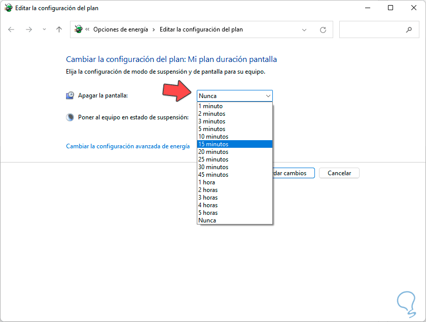 Entraremos directamente en nuestro plan actual. Aquí podremos cambiar el tiempo que pasa hasta "Apagar la pantalla". Podemos elegir el valor que queramos