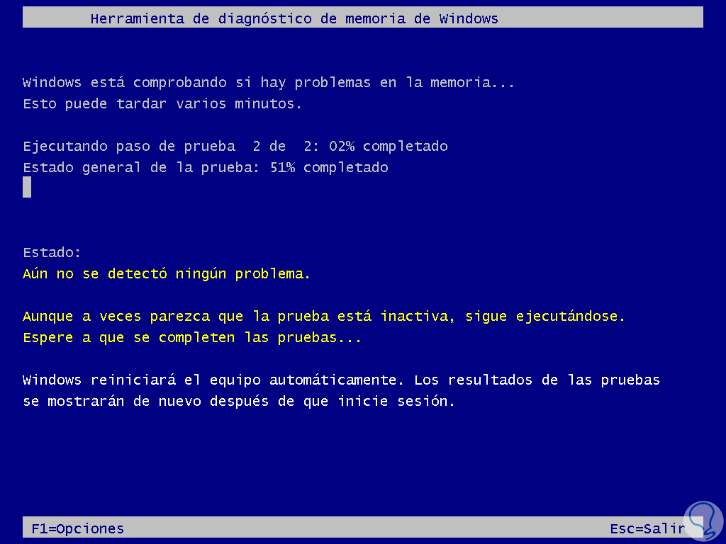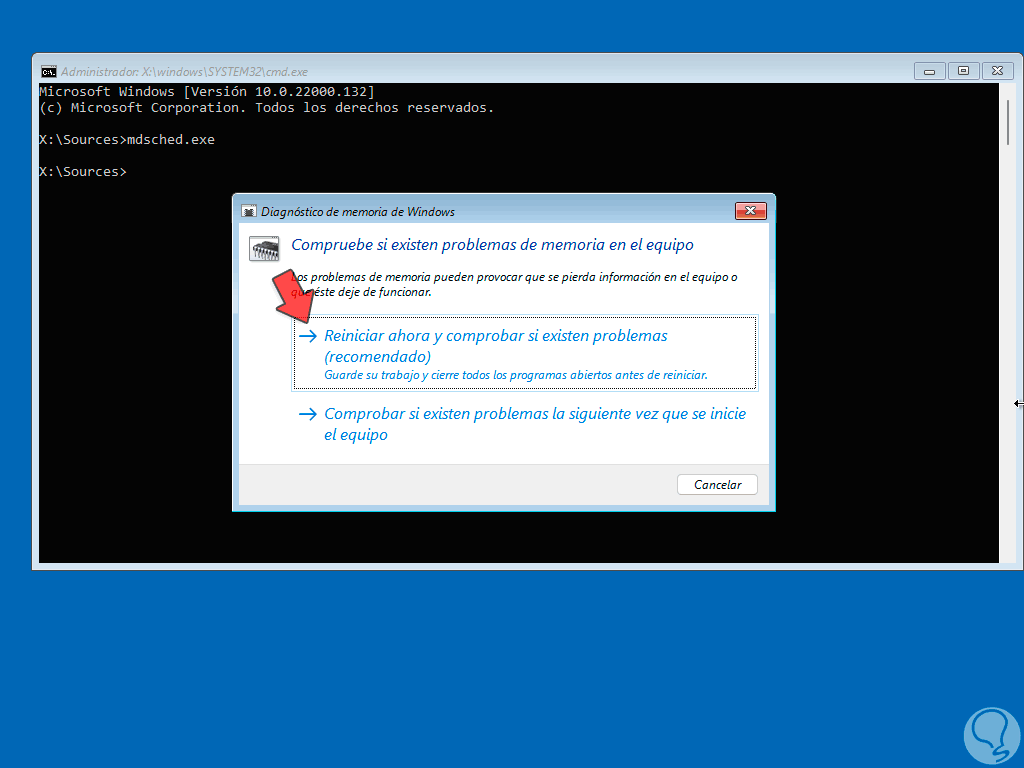 En la consola ejecutamos "mdsched.exe" y luego damos clic en "Reiniciar ahora y comprobar si existen problemas":