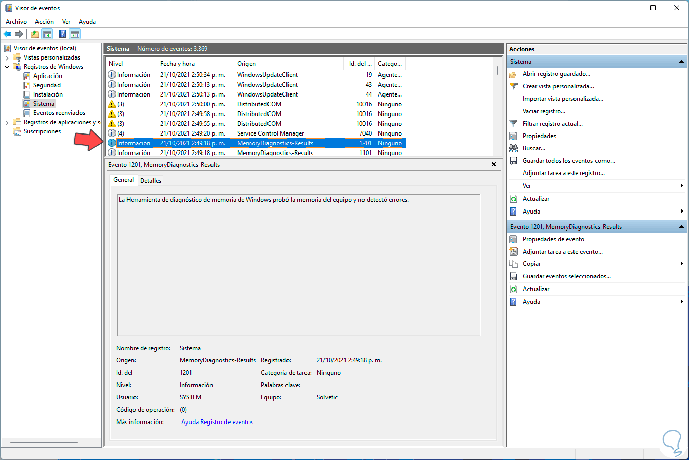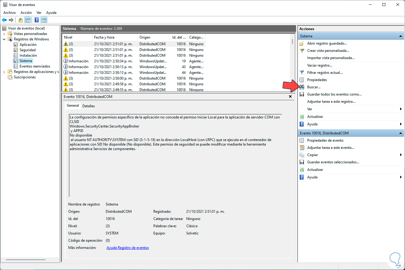 Vamos a "Registros de Windows - Sistema". Damos clic en "Buscar"