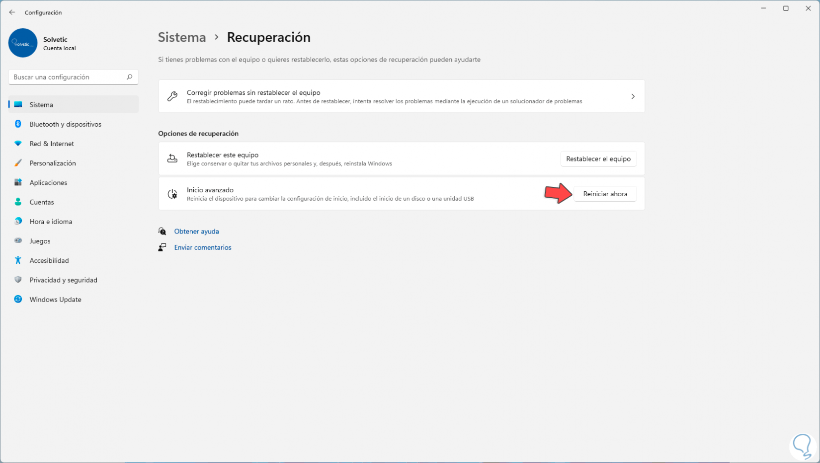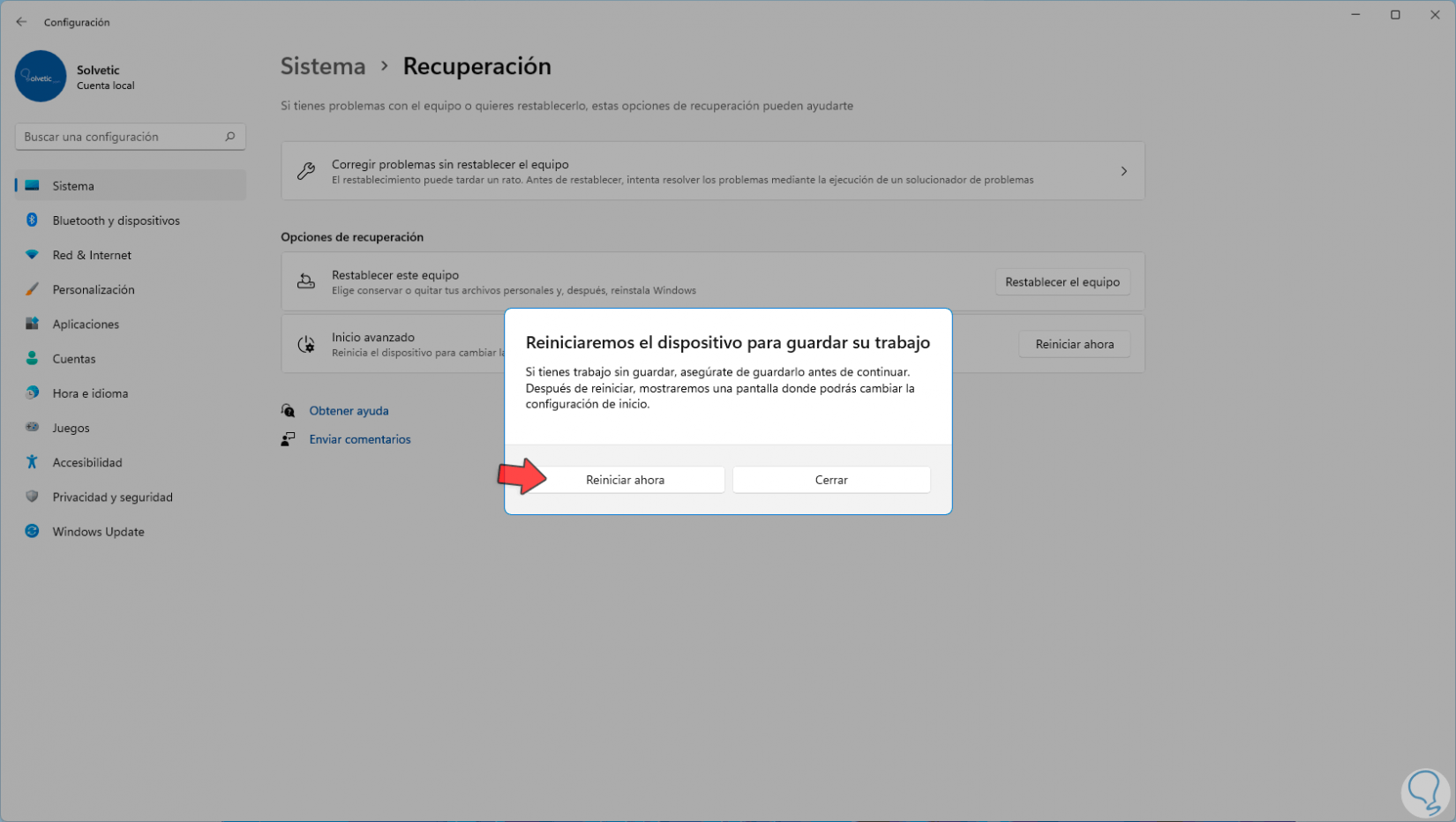 y será desplegado lo siguiente: Damos clic en "Reiniciar ahora y comprobar si existen problemas" y Windows 11 será reiniciado: