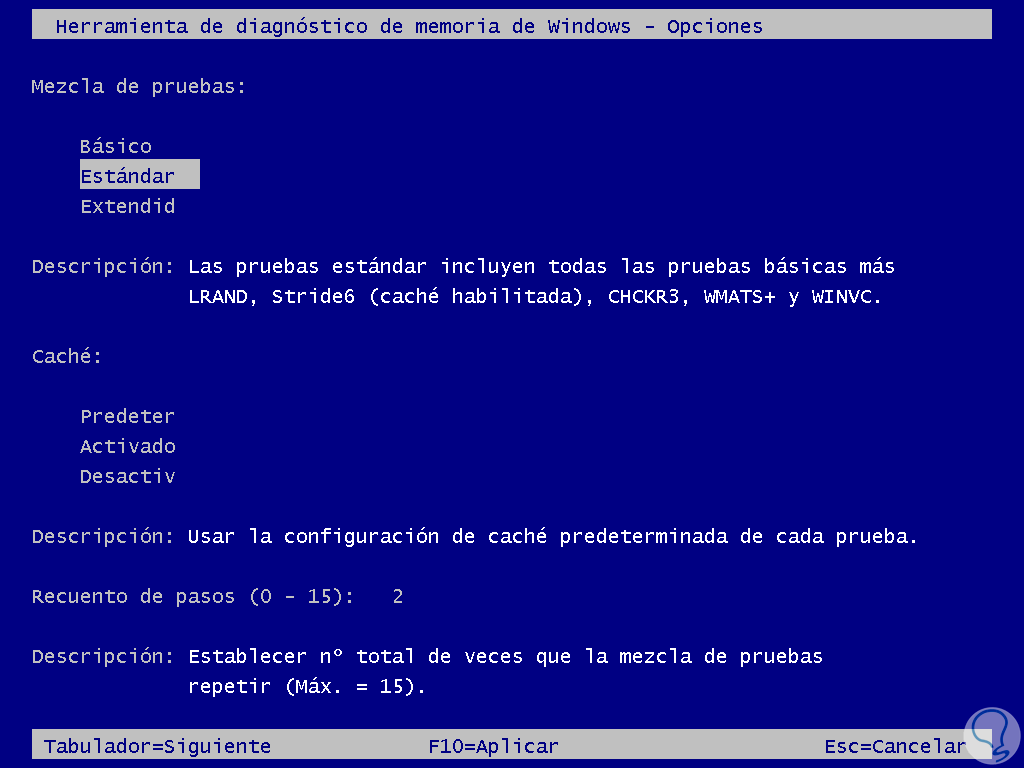 - Estándar: es el valor por defecto y ejecuta un análisis en las variables LRAND, Stride6 (con la cache habilitada),,CHCKR3 , WMATS+, WINVC