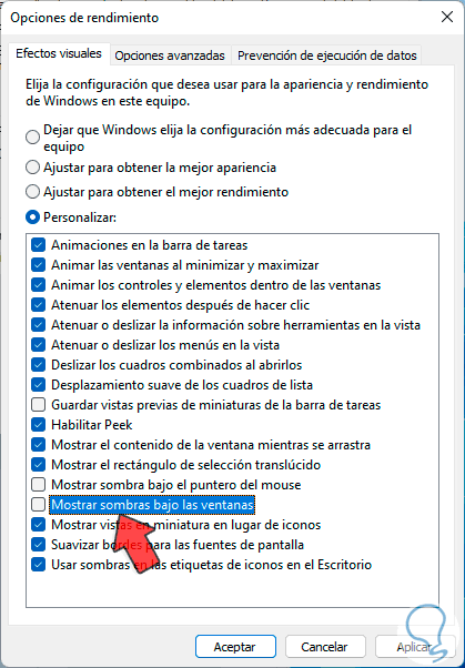 Desactivamos la casilla "Mostrar sombras bajo las ventanas":