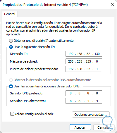 Activamos la casilla "Usar la siguiente dirección IP", ingresamos la nueva IP estática y completamos la máscara de red (de forma automática se asigna) , la puerta de enlace y los servidores DNS (es posible usar los servidores DNS públicos de Google):