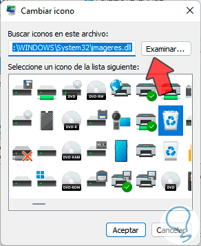 Damos clic en "Examinar" para seleccionar el nuevo icono para la Papelera de reciclaje: