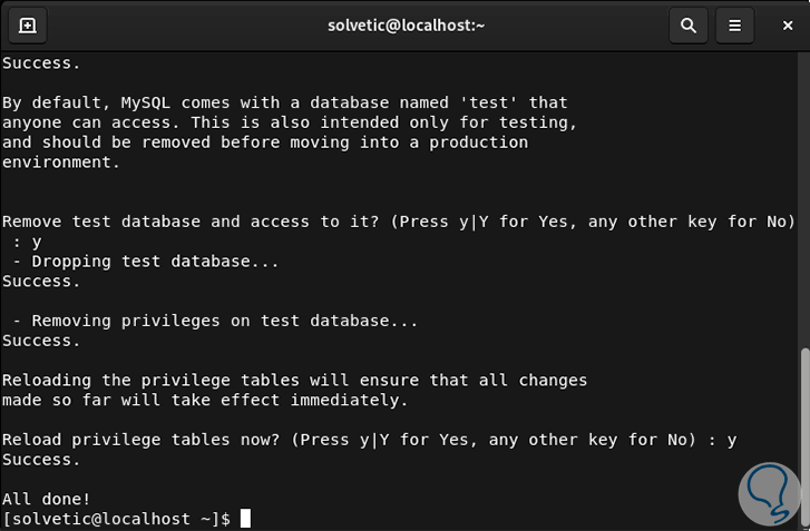 Ingresamos la letra "y" en todas las preguntas para proteger el acceso a MySQL: