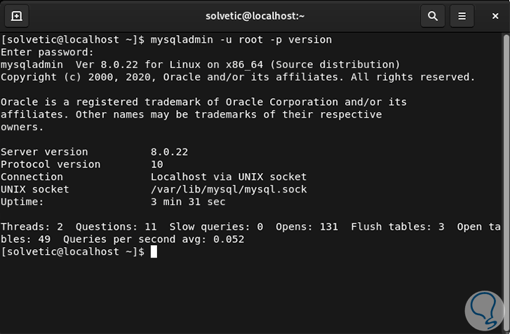 Después de esto, vamos a verificar la instalación y acceder a información sobre la conexión con la herramienta mysqladmin, esta es una utilidad para ejecutar comandos administrativos, vamos a ejecutar el siguiente comando con el fin de establecer la conexión con MySQL como root (-u root), luego solicitar la contraseña (-p) y así obtener la versión de MySQL: