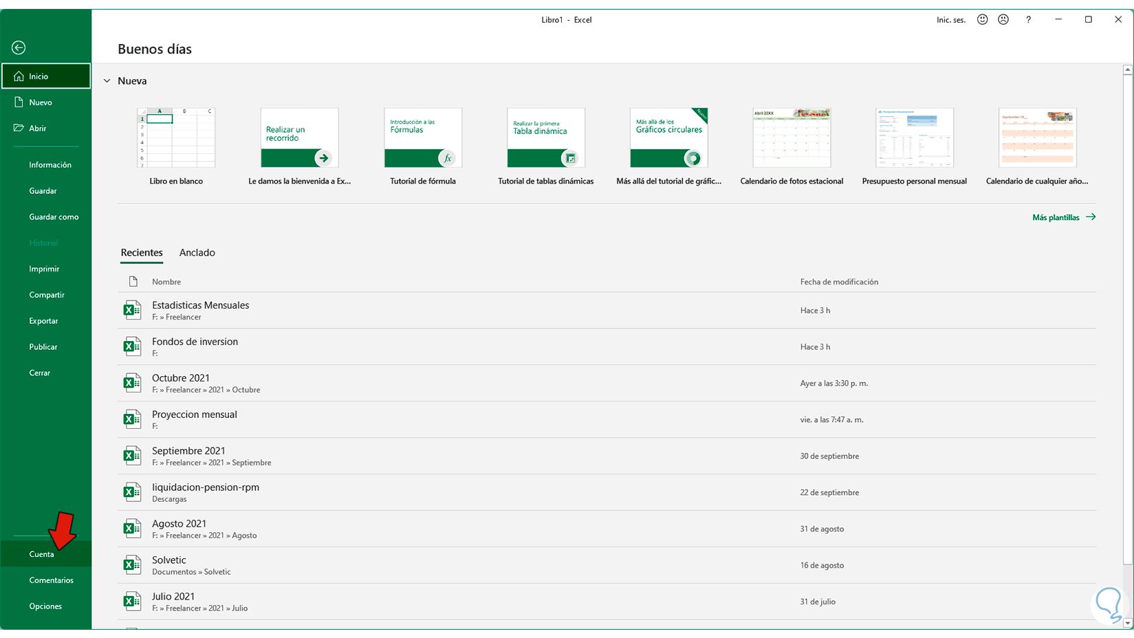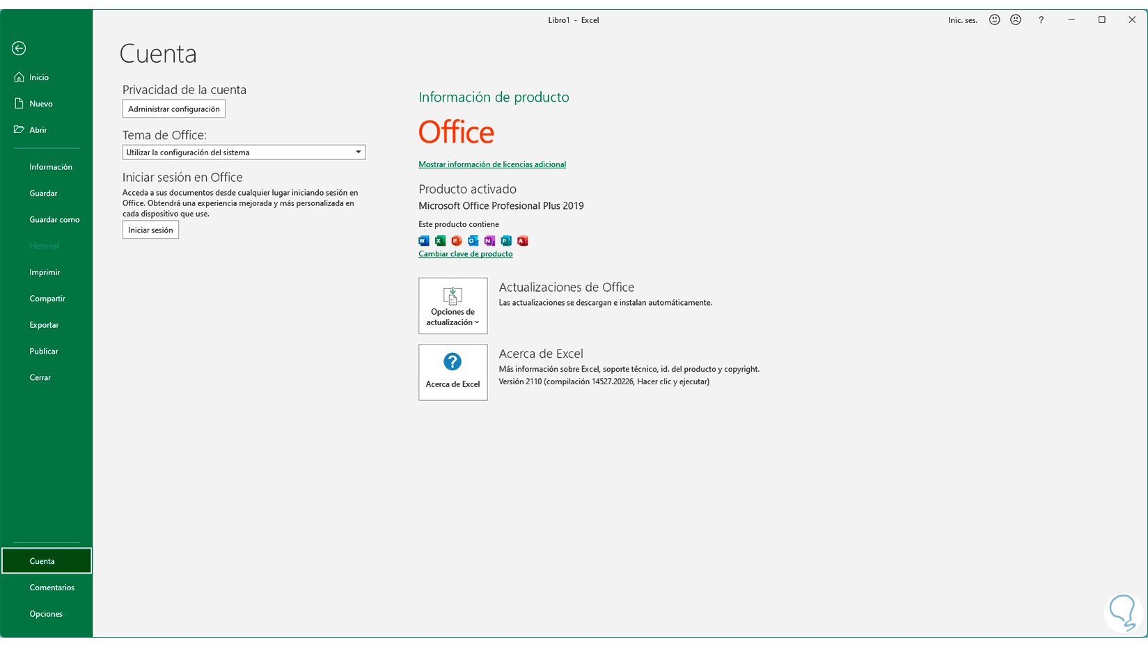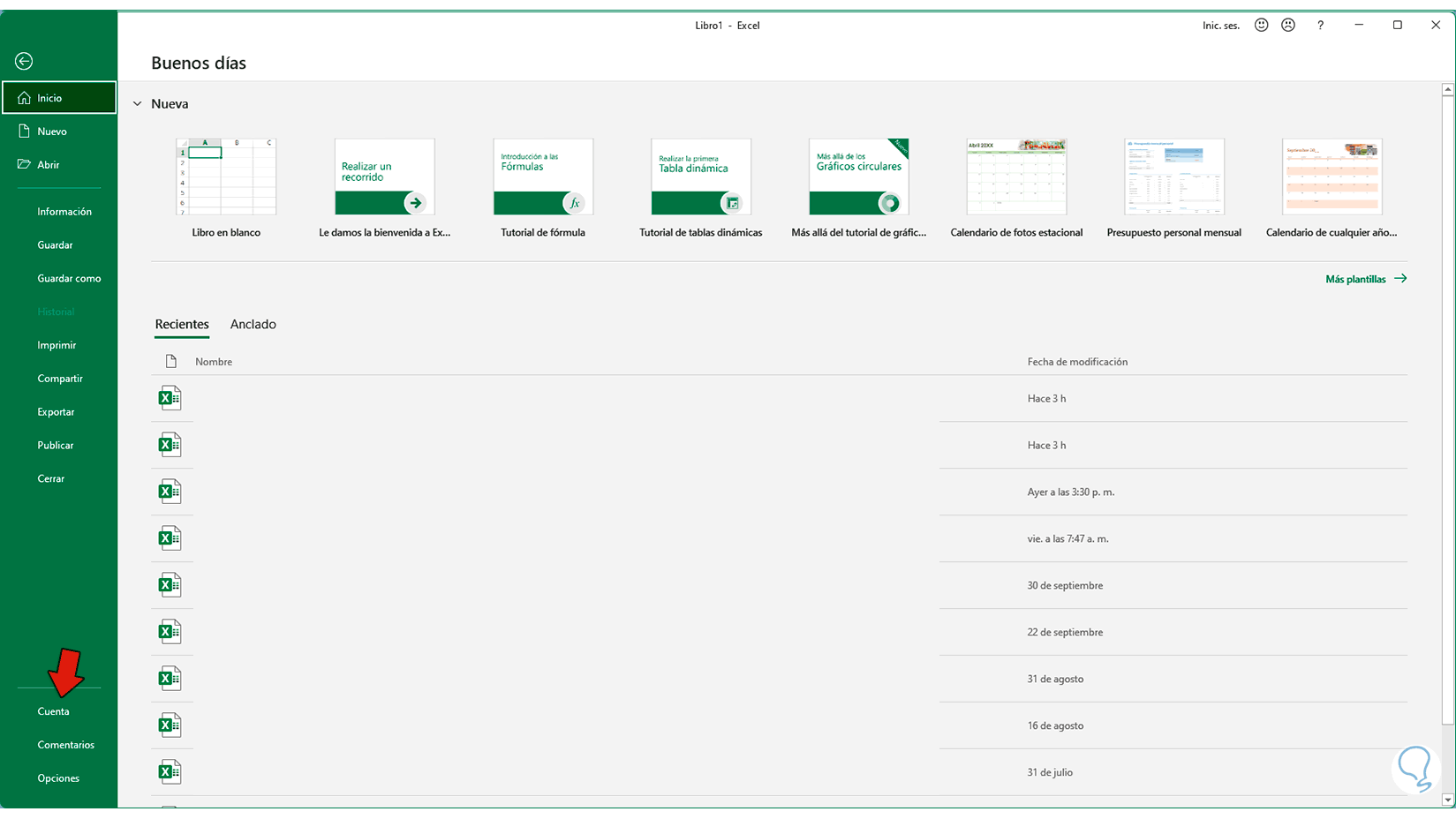 Para ello abrimos Excel y vamos a "Archivo - Cuenta":