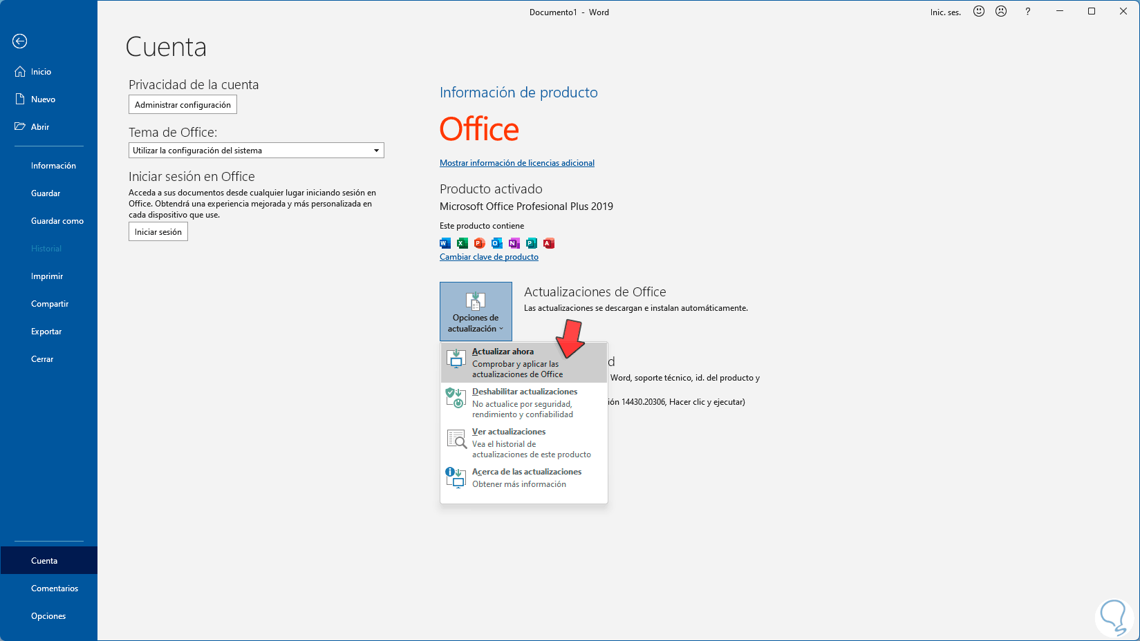 De forma automática Office puede buscar actualizaciones, descargarlas e instalarlas, para lograr esto, abrimos alguna de las aplicaciones de Office y vamos a "Archivo - Cuenta":