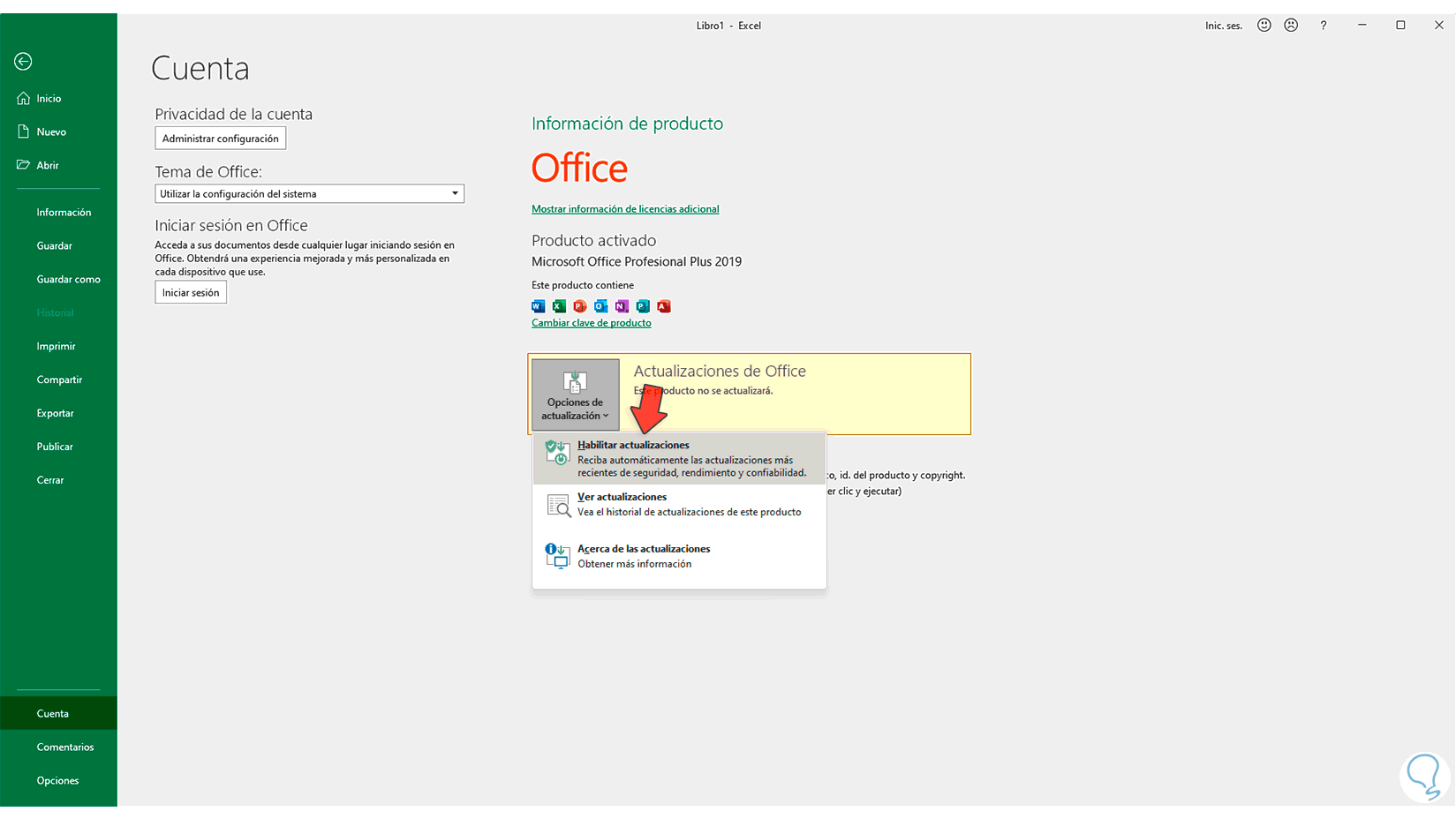 Veremos lo siguiente. Damos clic en "Opciones de actualización - Habilitar actualizaciones":
