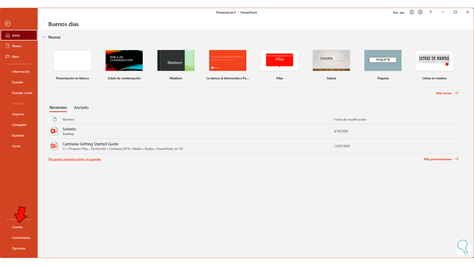 En el caso de PowerPoint, abrimos PowerPoint e iremos a "Archivo - Cuenta":