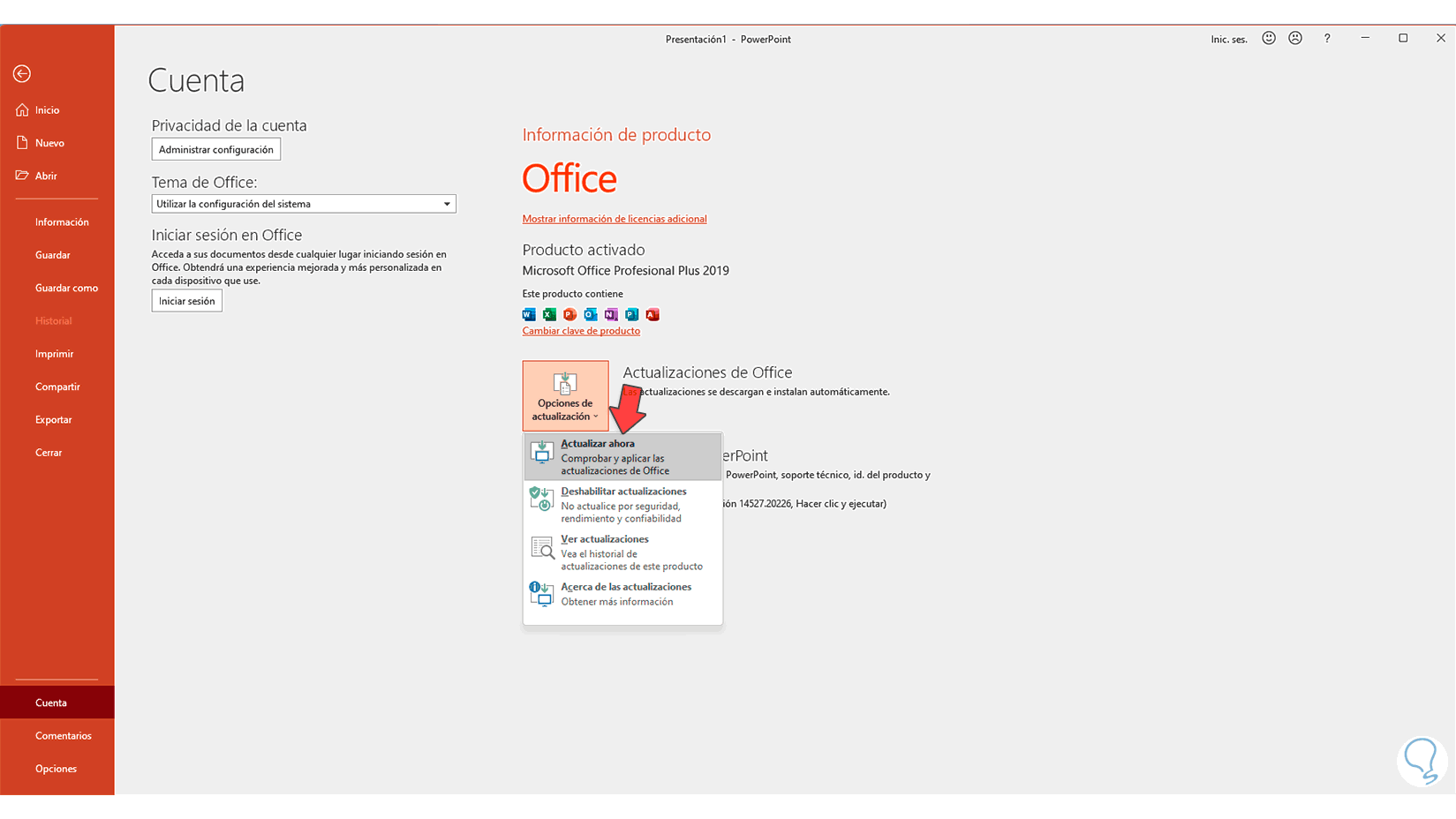 Office buscará actualizaciones para PowerPoint y las aplicará si existiesen: