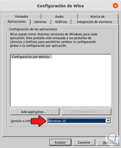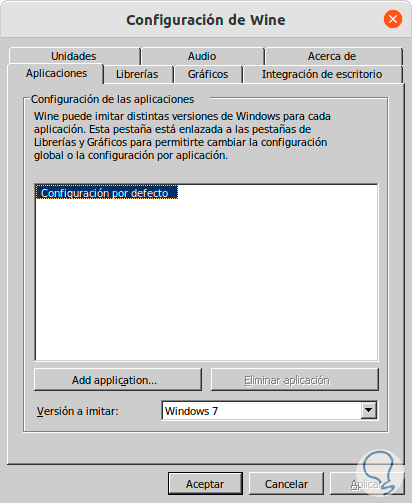 winecfgEsto abrirá una serie de opciones a usar en Wine como: Definir bajo que versión de Windows se ejecutaran las aplicaciones en Ubuntu.