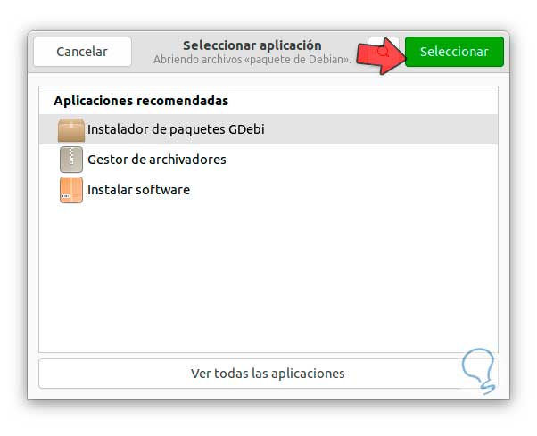 En la siguiente ventana seleccionamos "Instalador de paquetes Gdebi":