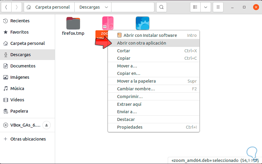 Damos clic derecho sobre el archivo descargado y seleccionamos la opción "Abrir con otra aplicación":