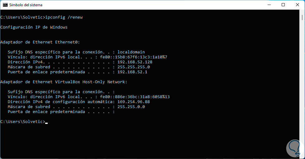 Como vemos la IP se renueva, esto ayuda a que todos los procesos vinculados a la red sean refrescados y podamos trabajar con normalidad. De esta forma hemos podido liberar IP Windows 11 o renovar IP Windows 11 fácilmente.